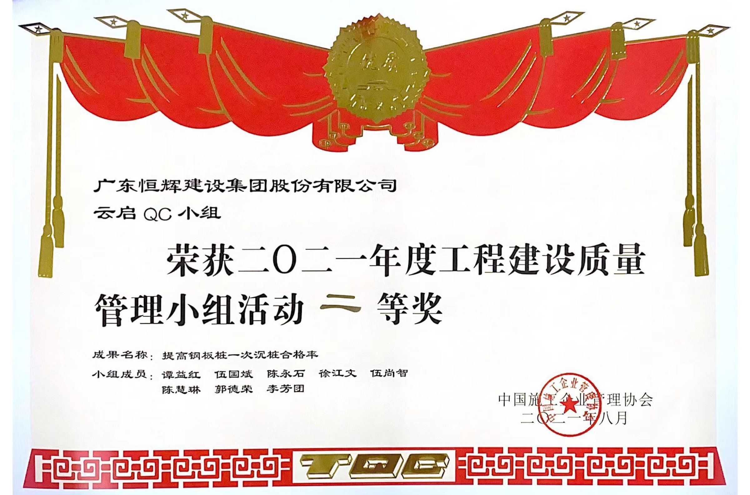 “廣東省工程建設(shè)優(yōu)秀質(zhì)量管理小組二等獎、三等獎”、“廣東省市政工程建設(shè)優(yōu)秀QC小組二等獎、三等獎”“廣州建設(shè)行業(yè)質(zhì)量管理小組活動二等獎、 三等獎”以及“廣州建設(shè)行業(yè)QC小組活動優(yōu)秀企業(yè)”等幾十項省級市級榮譽證書。